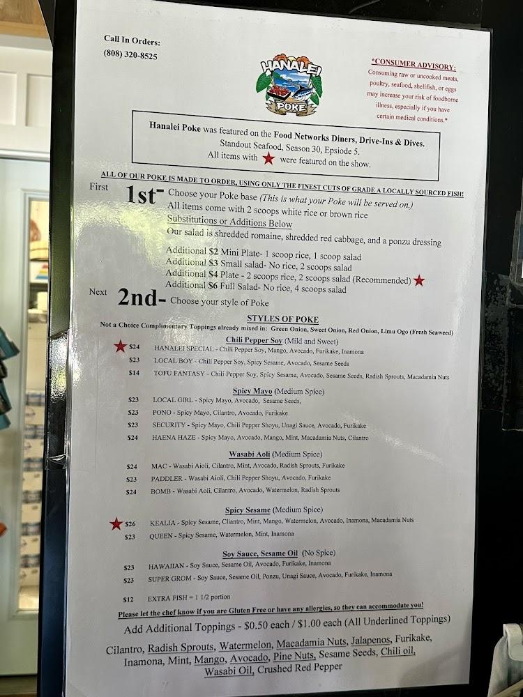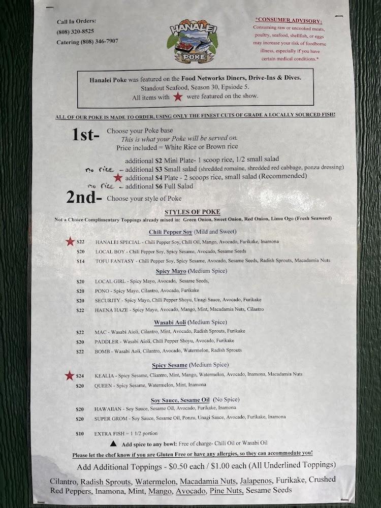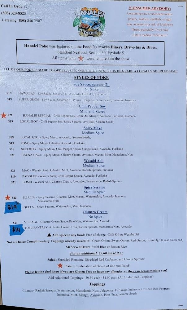 Hanalei Poke's menu specializes in poke bowls, crafted to highlight the freshest local seafood. With a range of flavors, the selection includes popular styles like Spicy Mayo, Chili Pepper Soy, and Wasabi Aoli. Each option brings unique tastes, appealing to a variety of palates.